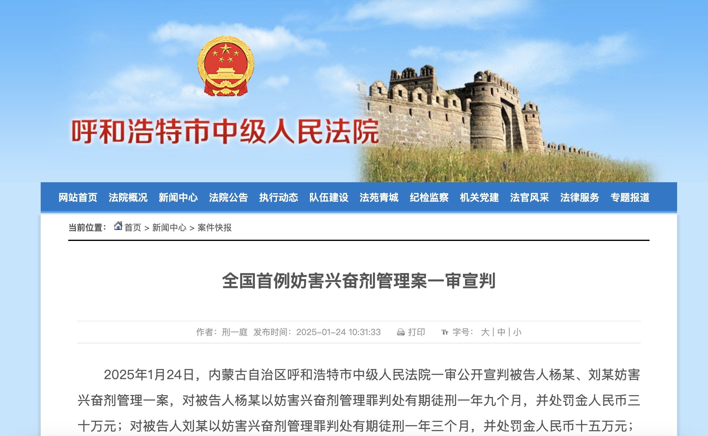 新华社呼和浩特1月24日电(记者王春燕、刘懿德)内蒙古自治区呼和浩特市中级人民法院24日发布消息,该院一审公开宣判被告人杨某、刘某妨害兴奋剂管理一案,杨某、刘某分别被判处刑期不等的有期徒刑,并处相应金额的罚金。