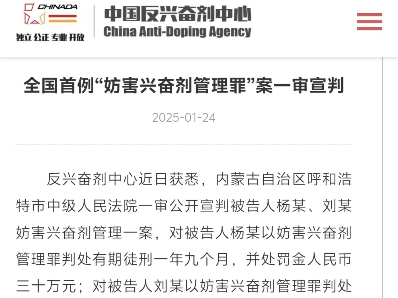 中国反兴奋剂中心24日在声明中表示,据了解,此案系《刑法修正案(十一)》“妨害兴奋剂管理罪”自2021年3月1日施行以来的第一案。